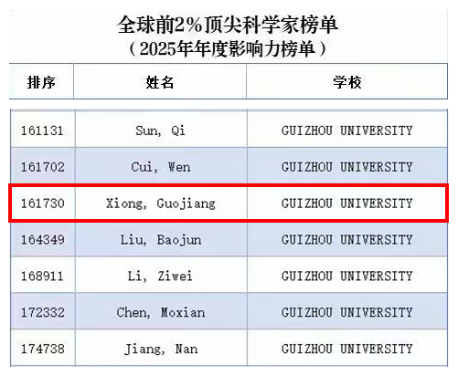 近日,斯坦福大学和国际权威学术出版社爱思唯共同发布了2025年全球前2%顶尖科学家榜单,贵州大学包括我院熊国江教授在内近百名科学家入榜。