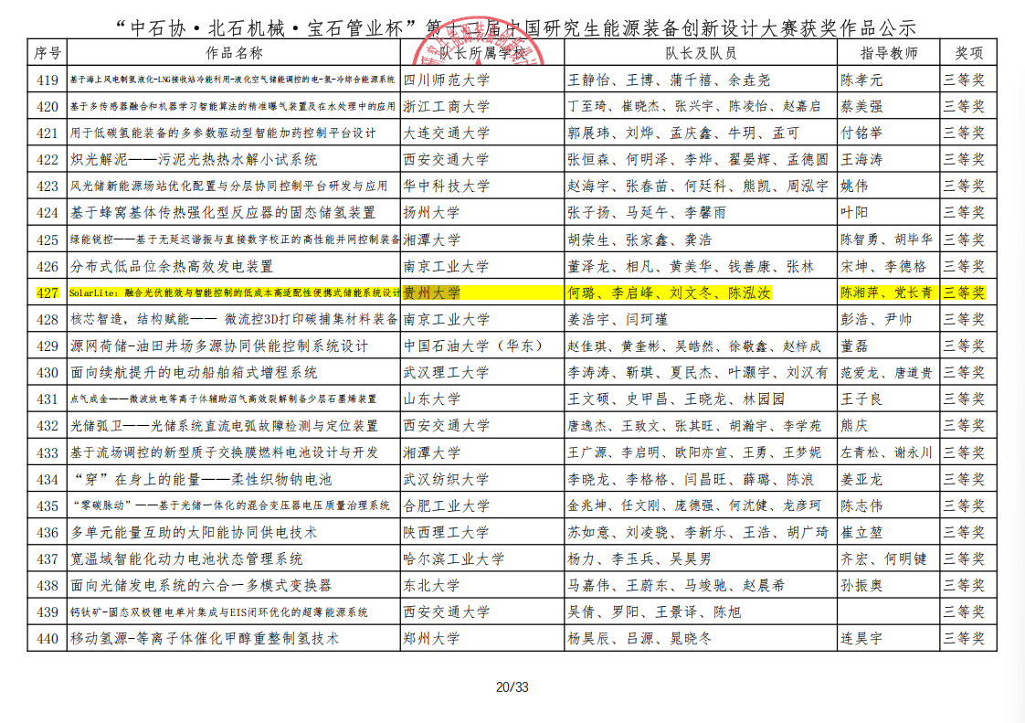 SolarLite:融合光伏能效与智能控制的低成本高适配性便携式储能系统设计,国家级三等奖。参赛学生:何璐、李启峰、刘文冬、陈泓汝,指导老师:陈湘萍、党长青。