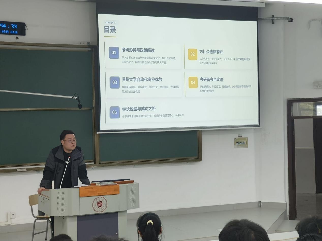 王霄老师深入分析2025-2026最新考研政策、报名人数趋势、国家线变化,帮助同学们了解考研大环境并从个人发展、职业竞争力、薪资水平、学术追求等多维度分析了考研的重要意义。他全面展示了学院在学科建设、师资力量、就业质量、考研等方面的突出优势,并从时间规划、科目复习、资料选择、心态调整等方面提供了系统性指导。