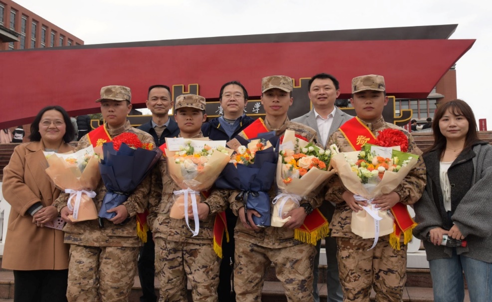 学院师生和同学们为学院新兵们送上鲜花并合影,勉励他们在部队淬炼成钢,以实际行动践行 “爱国崇德、团结自强、创新唯实” 的电工院训。